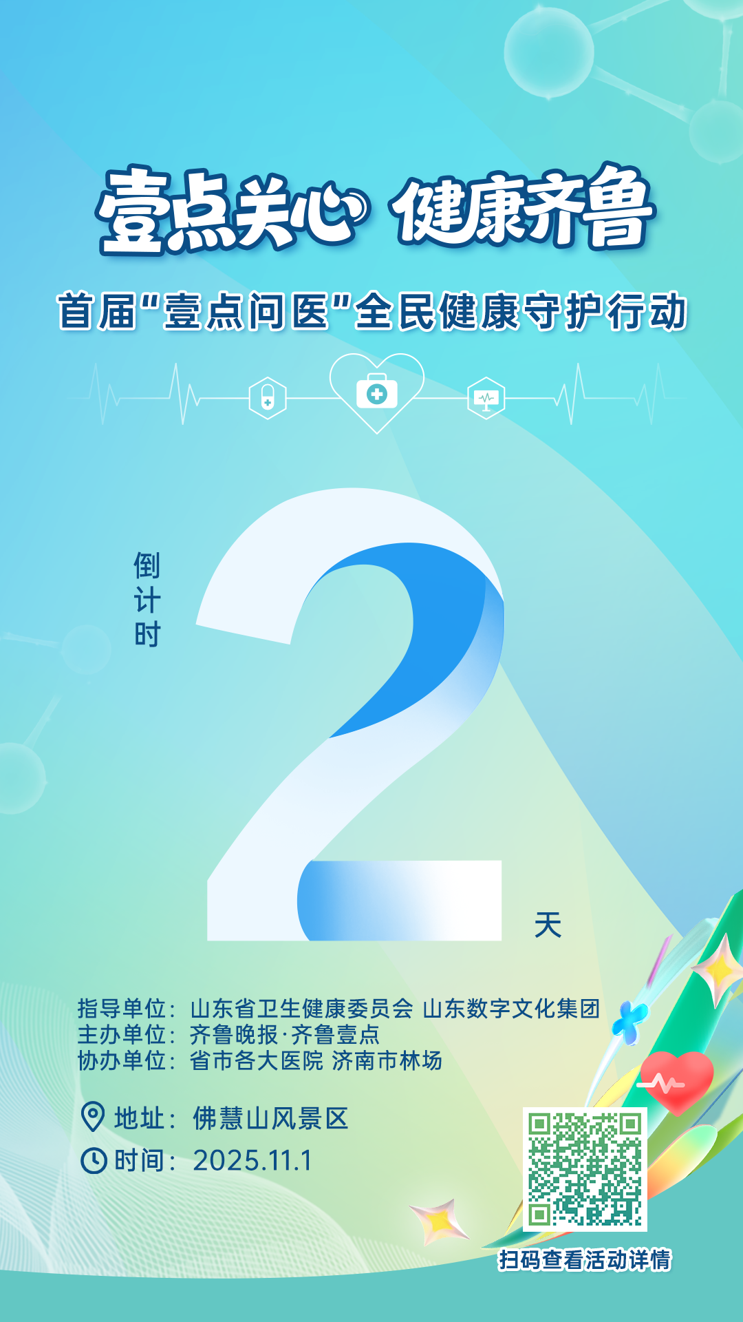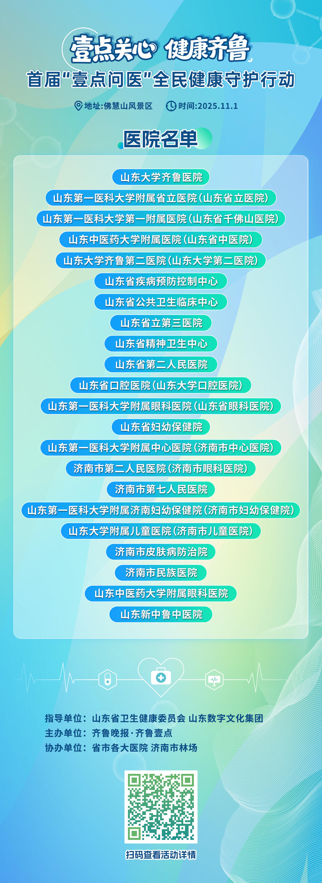 11月1日(本周六)9:00-12:00,济南佛慧山北门广场将迎来一场“健康盛宴”——首届“壹点问医”全民健康守护行动将正式启动。山东大学齐鲁医院、山东第一医科大学附属省立医院(山东省立医院)、山东第一医科大学第一附属医院(山东省千佛山医院)、山东中医药大学附属医院(山东省中医院)、山东大学齐鲁第二医院(山东大学第二医院)等22家省市重点医疗机构组团入驻,200余名覆盖内科、外科、妇产科、儿科等全科室的专家将共同在现场,用专业诊疗与贴心服务把优质健康保障送到市民家门口。