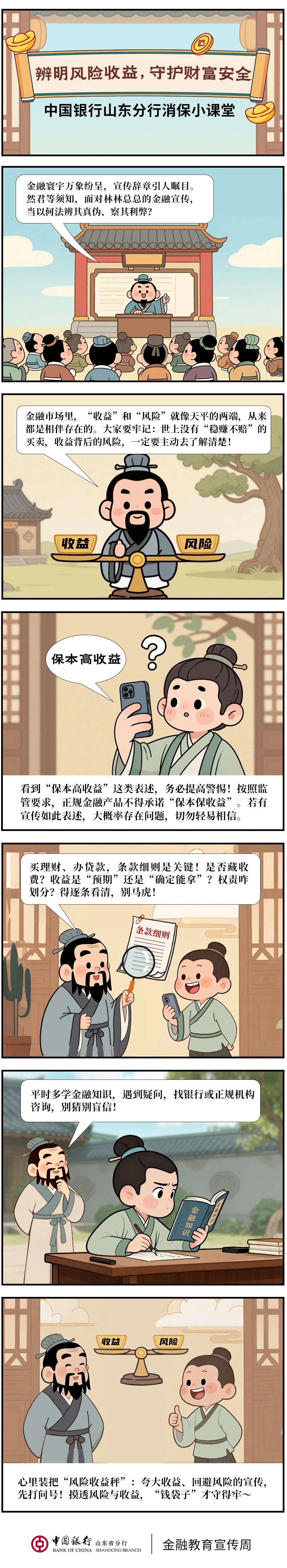 编者按:千年古训,蕴藏穿越时空的智慧。当今金融世界瞬息万变,但“诚信、安全、公平”理念却始终与中华文化一脉相承。2025年山东省金融教育宣传周之际,中国银行山东省分行以“以古鉴今”为主线,推出消保主题系列漫画,将先贤哲思化作现代金融生活的护身符,保障金融权益,助力美好生活。本期推出“辨明风险收益,守护财富安全”,通过借智士之眸,解析“风险收益天平”之道,引导消费者守本心、观大势,理性选择,筑就长安财富。