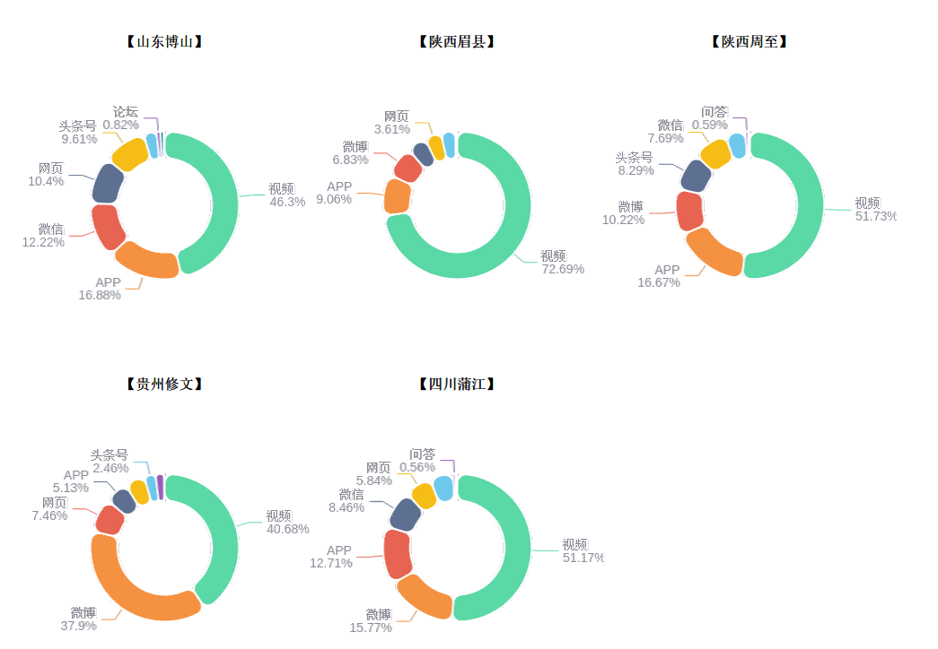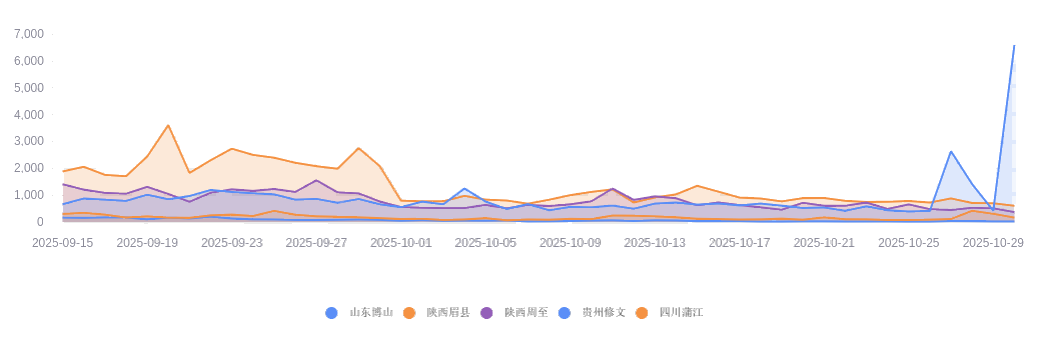 据齐鲁蛙眼数智决策平台,在分析时间段内,“山东博山”方案信息量共3028条,“陕西眉县”方案信息量共62211条,“陕西周至”方案信息量共37066条,“贵州修文”方案信息量共41094条,“四川蒲江”方案信息量共7875条。 从综合传播变化趋势来看,“山东博山”方案传播热度在9月22日达到了峰值196条,“陕西眉县”方案传播热度在9月20日达到了峰值3607条,“陕西周至”方案传播热度在9月27日达到了峰值1553条,“贵州修文”方案传播热度在10月30日达到了峰值6594条,“四川蒲江”方案传播热度在10月28日达到了峰值415条。