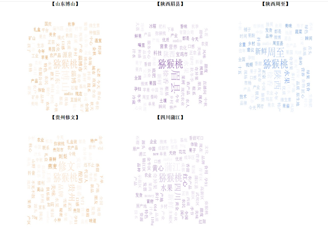 在分析时间段内,“山东博山”方案中,被提及频次最高的TOP3词语分别为猕猴桃(2095)、博山(1902)、淄博(740);“陕西眉县”方案中,被提及频次最高的TOP3词语分别为猕猴桃(57367)、眉县(55543)、徐香(22698);“陕西周至”方案中,被提及频次最高的TOP3词语分别为猕猴桃(30381)、周至(25156)、陕西(17543);“贵州修文”方案中,被提及频次最高的TOP3词语分别为猕猴桃(34059)、修文(32489)、贵州(20789);“四川蒲江”方案中,被提及频次最高的TOP3词语分别为猕猴桃(6076)、蒲江(5434)、四川(3961)。