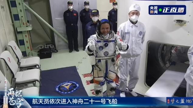 神舟二十一号载人飞船瞄准北京时间10月31日23时44分发射。神二十一航天员张陆进入飞船返回舱。 (央视新闻)