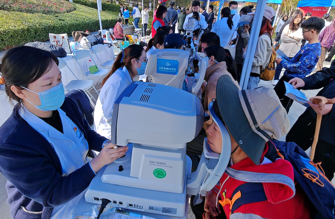 山东第一医科大学附属眼科医院(山东省眼科医院)展位前,在医护人员的引导下有序排起了队。医院带来了视力表灯箱、验光仪、眼压计、裂隙灯等共计6台专业眼科检查设备,涵盖多个基础且重要的眼科项目,可以筛查出不同年龄段的常见眼科疾病。短短一上午,眼科团队就为300多名市民完成了检查。