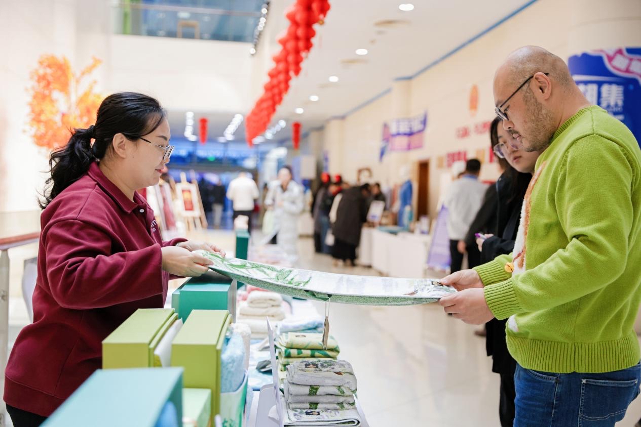 如果说T台是时尚创意的“高光展示窗”,市集便是产业成果贴近民生的“体验落脚点”,T台旁同步开展的“潮集潍坊”消费市集人头攒动,希努尔、孚日、华晨纺织等16家企业带来涵盖精品时装、高端家纺、创意针织、精美刺绣等16大类400多款产品,纺织服装好物一站式集结,广大市民穿梭于各展位之间,或挑选心仪的时尚服饰,或品鉴精湛的工艺细节。