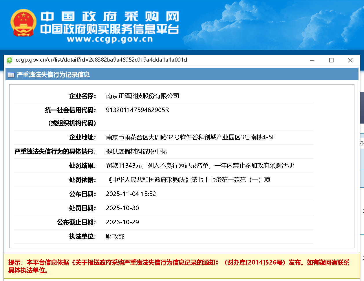 近日,齐鲁晚报·齐鲁壹点记者从中国政府采购网获悉,南京正泽科技股份有限公司因提供虚假材料谋取中标,被财政部罚款11343元,列入不良行为记录名单,一年内禁止参加政府采购活动。