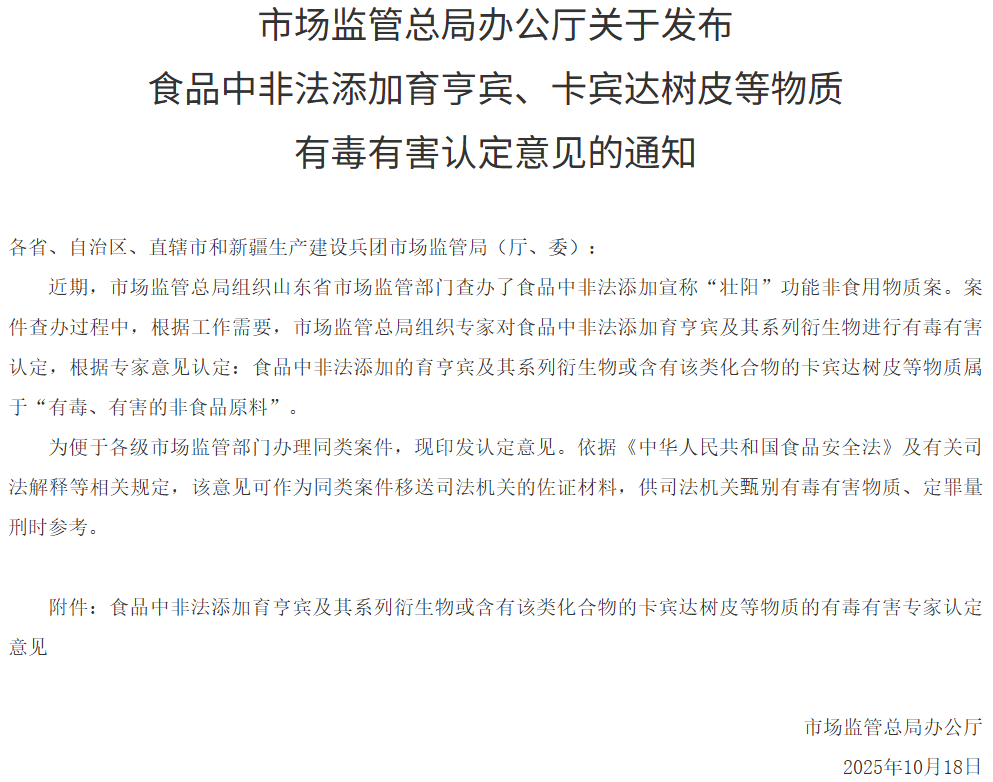 市场监管总局:食品中非法添加育亨宾、卡宾达等物质,有毒有害!
