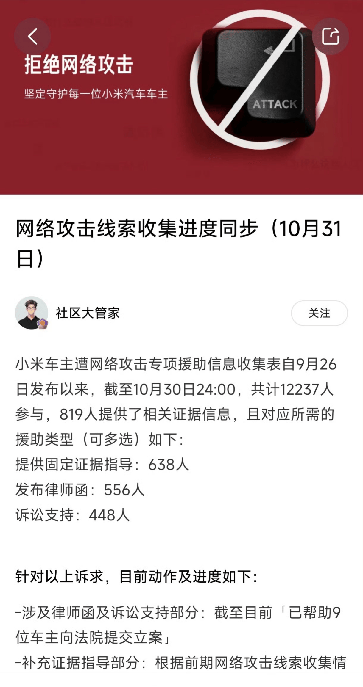 为了维护车主权益,车企开始帮助车主抵制网暴。9月,小米汽车方面宣布开通专项通道,收集用户反馈并提供维权协助。截至10月30日24时,该项目共有12237人参与,帮助556人发布律师函,为448人提供诉讼支持等。小米此举受到车主广泛好评。