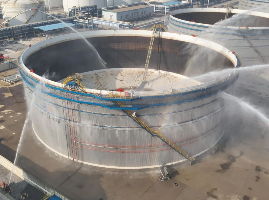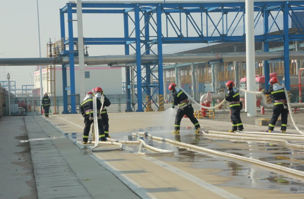 仪式现场模拟原料油罐区V101储罐发生油品泄漏着火事故。发生险情后,企业专职消防队迅速启动应急预案,对初期火灾进行扑救,随后消防救援人员到达现场,出动灭火力量对现场火势进行控制并对邻近的罐体进行降温保护,经全力扑救,储罐泄漏着火事故处置完毕。