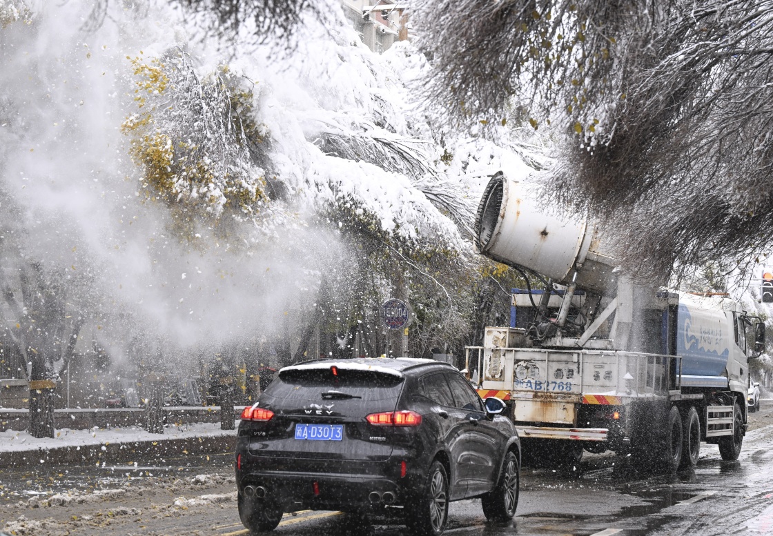 11月6日,在乌鲁木齐市红山路,环卫部门工作人员利用机械吹落树顶积雪,以防积雪压断树枝,排除安全隐患。新华社