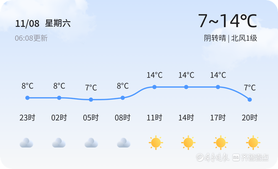 今天是11月8日,星期六,农历九月十九。德州今日天气以阴转晴为主,早晨气温较低,为7℃,白天最高气温可达14℃,北风1级,空气湿度较高,为95%。整体来看,德州各区天气情况基本一致,均为阴转晴,风力较小,适合户外活动。当前时间为0608,气温11.4℃,空气质量良好,PM2.5指数为73。