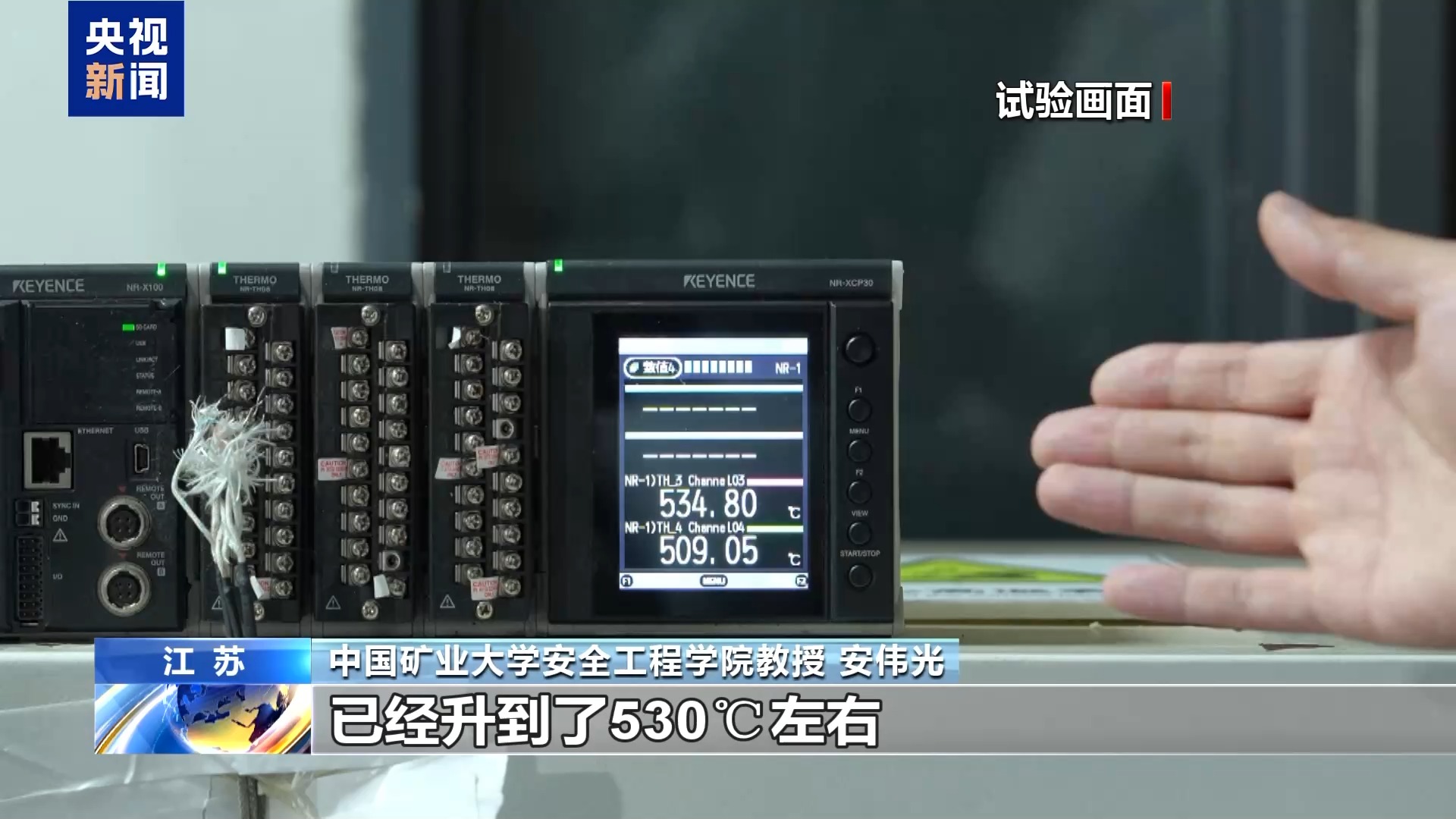 中国矿业大学安全工程学院教授 安伟光:铝塑板点燃之后,火蔓延速度非常快,温度升高非常迅猛。目前温度已经升到了530℃左右,间接说明这种材料的燃烧热值和热释放速率很高。