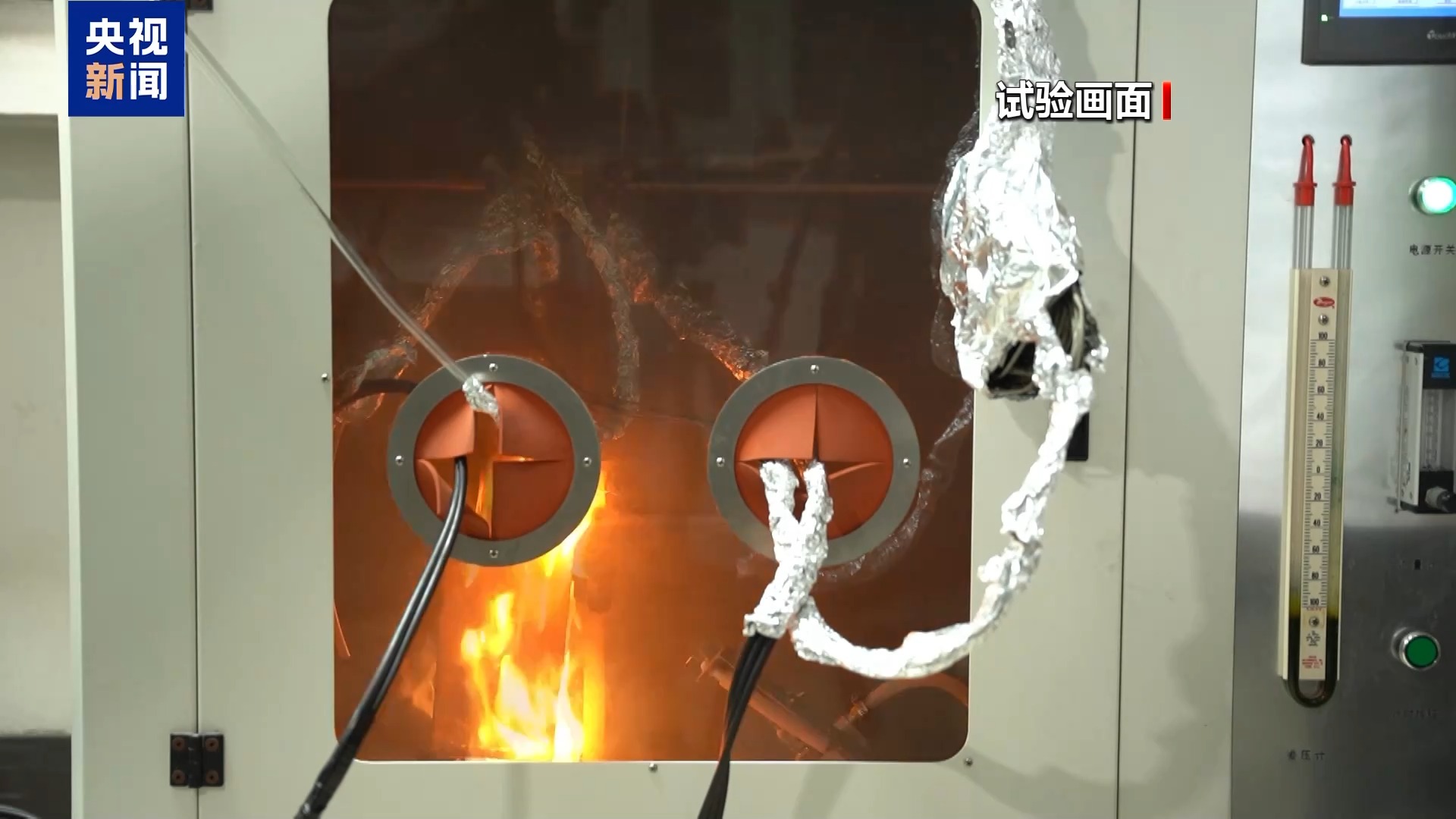 工作人员将另一种常用的建筑保温材料聚氨酯泡沫板放入实验舱。点火瞬间,火焰有半米高,温度在几十秒内就突破了800℃。