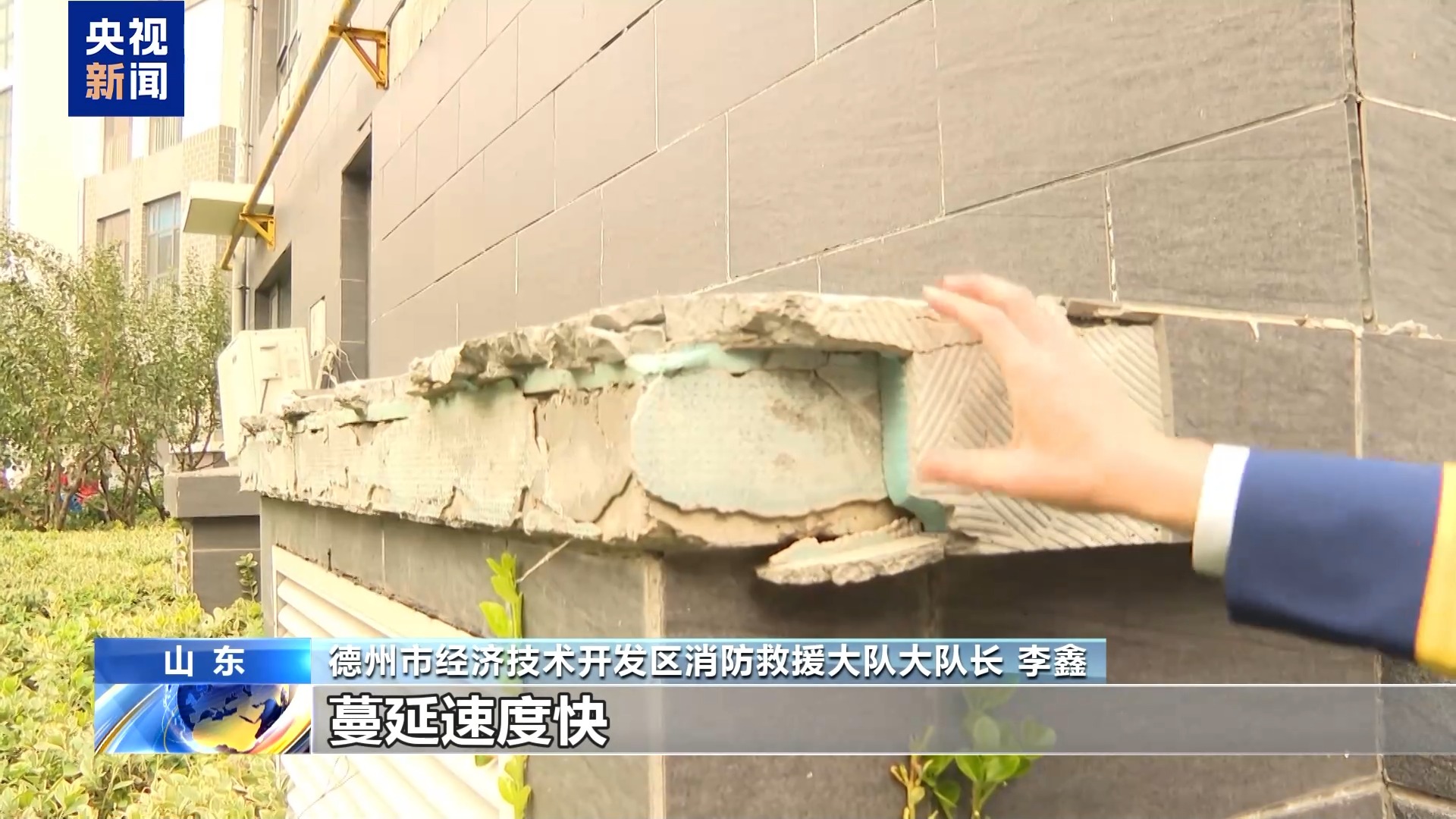 在山东德州,居民楼外墙同样有保温层剥落。消防人员现场测试,剥落材料遇火即燃。