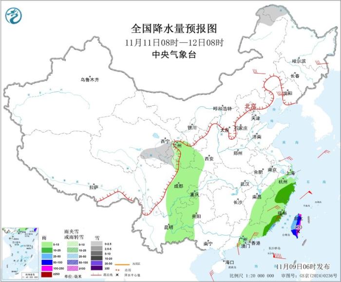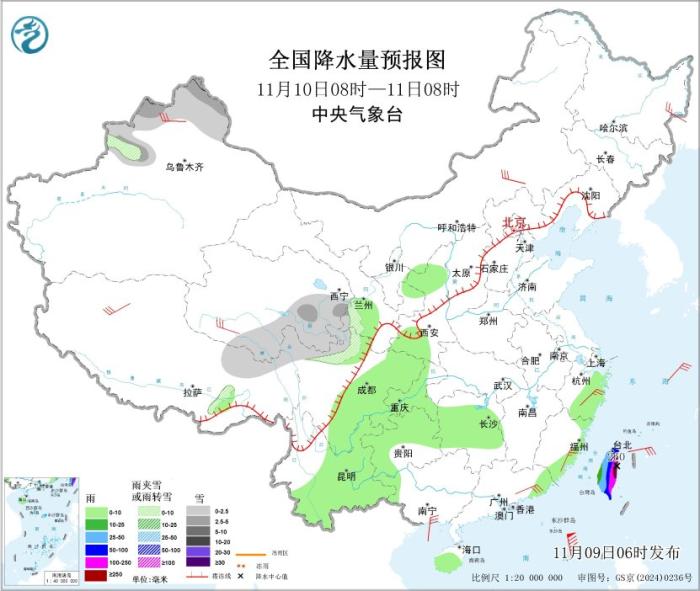 11月10日8时至11日8时,新疆北疆地区和伊犁河谷、西藏东部、西北地区中部、川西高原北部等地部分地区有小到中雪或雨夹雪。西南地区东部和南部、湖南中部和西部、华南沿海地区、海南岛中部和南部、台湾岛等地的部分地区有小到中雨,其中,台湾岛部分地区有大到暴雨,局地大暴雨或特大暴雨(250~260毫米)。新疆北疆地区、内蒙古中部、西藏北部、青海西南部、福建东部和广东东部沿海地区等地的部分地区有5~6级风,阵风7~8级。