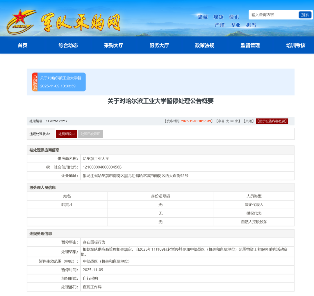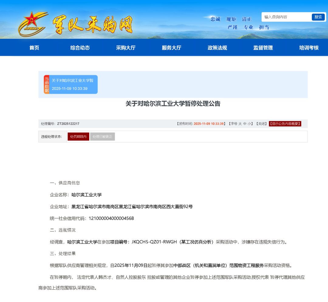 近日,军队采购网发布关于对哈尔滨工业大学暂停处理公告和关于对哈尔滨工程大学暂停处理公告。