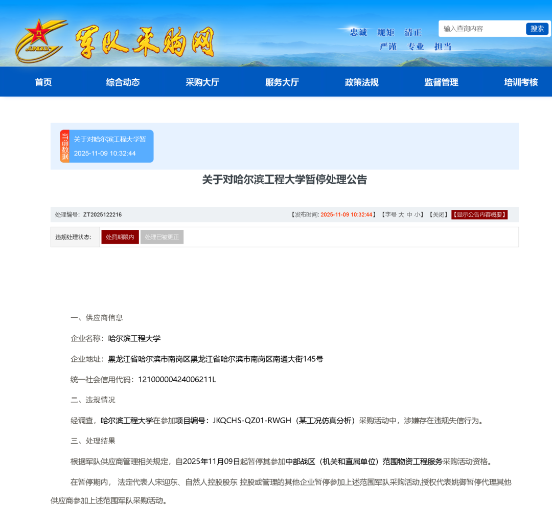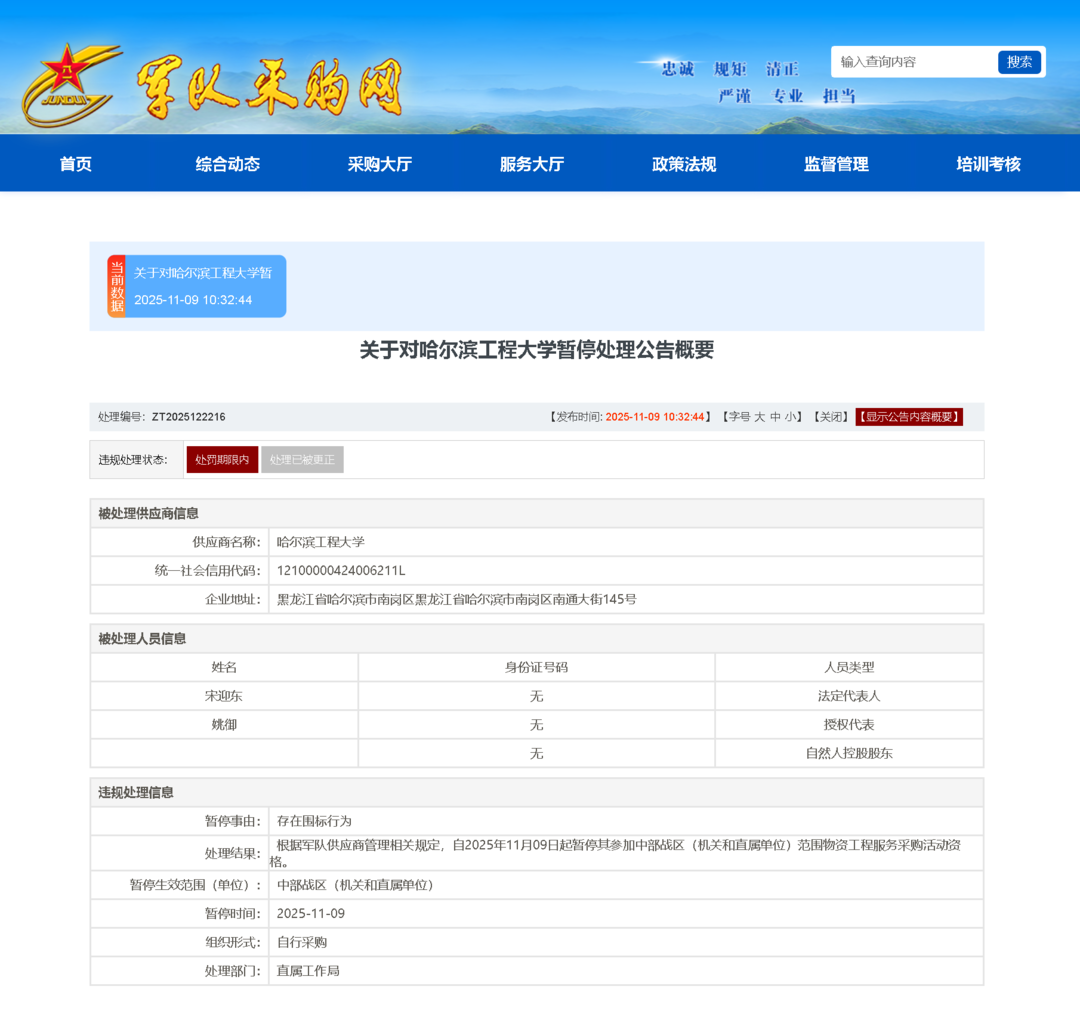 哈尔滨工业和哈尔滨工程大学因围标行为被暂停中部战区采购资格