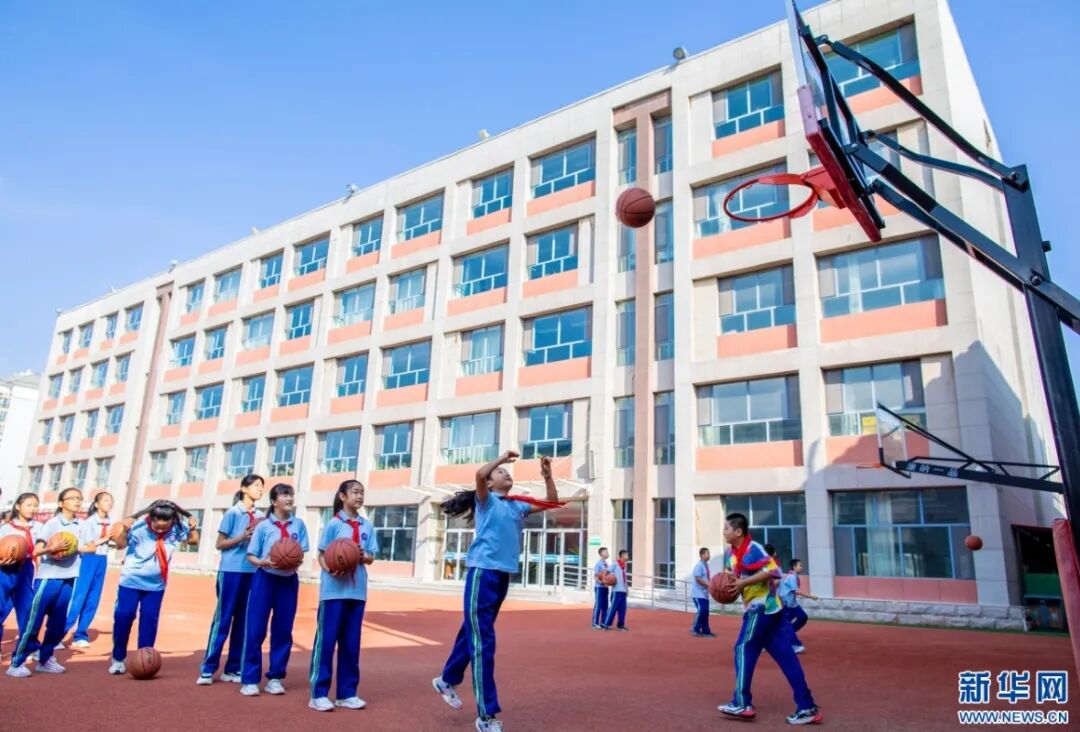 学生在体育课上练习投篮。新华网发(丁根厚 摄)