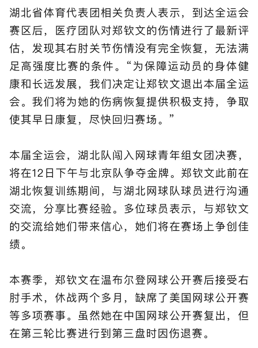 记者12日上午从第十五届全国运动会湖北省体育代表团获悉,巴黎奥运会网球女单金牌得主郑钦文将缺席本届赛事。 此前,郑钦文报名参加十五运会网球女子单打、双打比赛,开幕式上她作为湖北省体育代表团旗手亮相,希望在全运会赛场上为家乡争光。 (央视新闻)