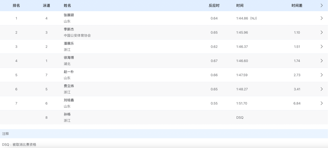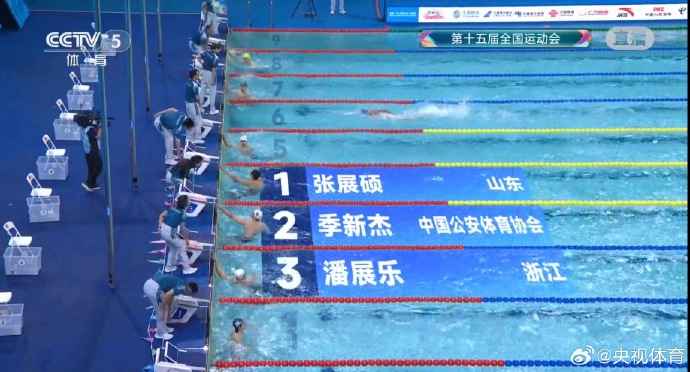 11月12日晚,第十五届全运会男子200米自由泳决赛,张展硕以1分44秒86的成绩夺得金牌,并打破全国青年纪录!季新杰获得银牌,潘展乐拿到铜牌。 本场比赛,孙杨的成绩位列第八,显示DSQ(被取消比赛资格)。 赛后,孙杨在接受采访时表示,抢跳把自己的状态全打乱了,多少有一些影响。 (南方都市报)