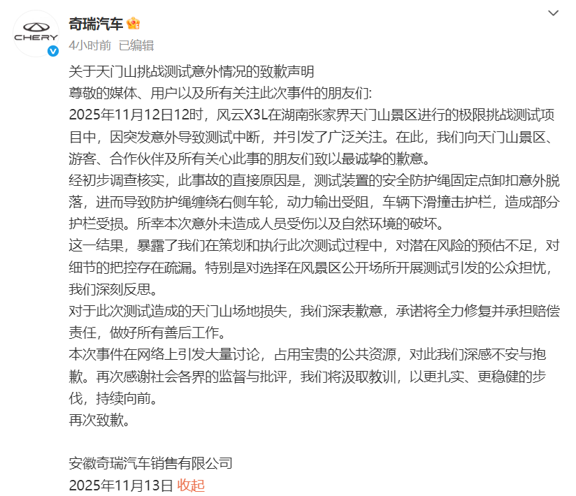 13日凌晨,安徽奇瑞汽车销售有限公司发布天门山挑战测试意外情况的致歉声明。