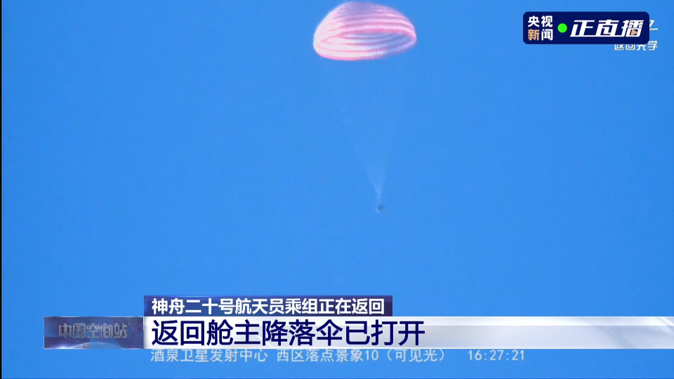 新华社快讯:神舟二十一号载人飞船返回舱主伞已经打开,即将着陆东风着陆场。 (新华社)
