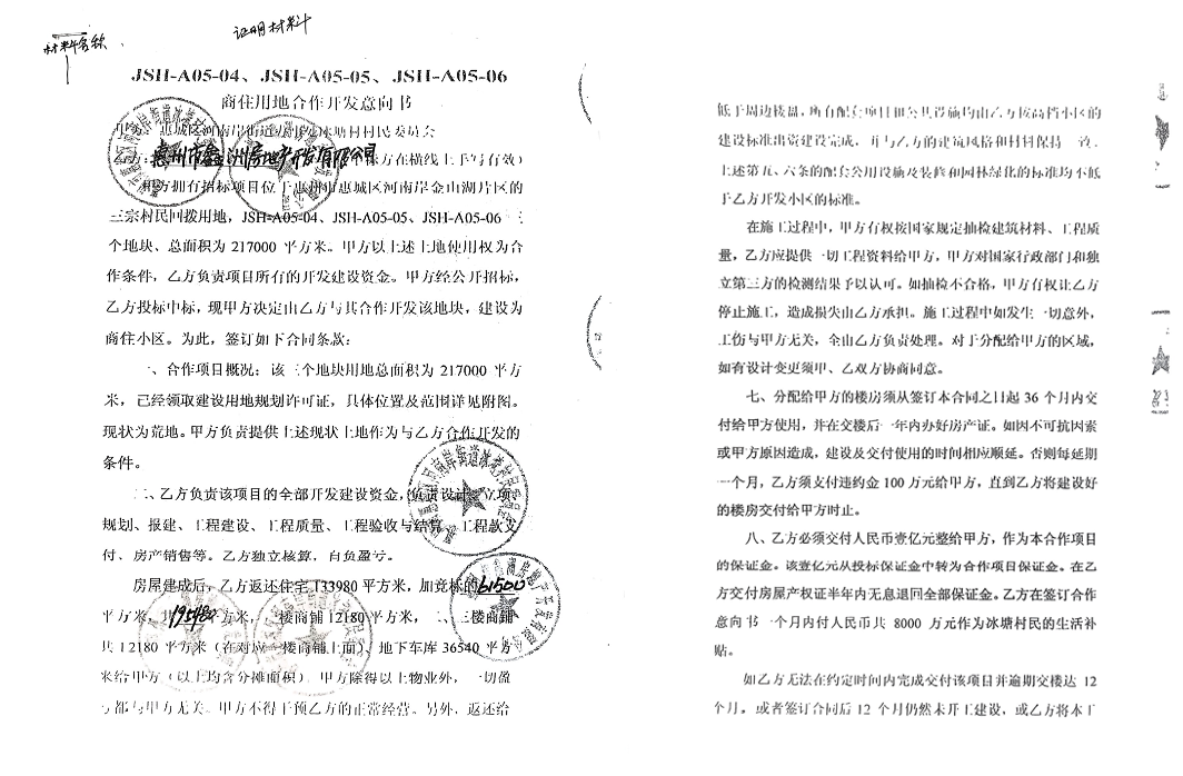 据刘先生介绍,2013年,惠城区河南岸街道办事处冰塘村村民委员会与惠州市鑫洲房地产开发有限公司(下文称鑫洲公司)签署了《商住用地合作开发意向书》,以村企合作形式开发金山湖片区的三块土地,总面积达217000平方米,计划建设商住小区。意向书约定,房屋建成后,开发公司需向村委会返还住宅、商铺、地下车库等物业,并在签约后一个月内支付约8000万元作为村民生活补贴。