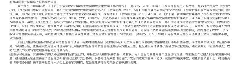 根据惠城区人民政府网站公开的《印发惠城区农村集体经济组织留用地使用与合作开发建设管理补充规定的通知》中的《惠城区农村集体经济组织留用地使用与合作开发建设管理补充规定》,在2016年5月3日前已签订村企合作合同,并经过镇政府审核、区政府备案的项目,其前期工作持续有效。