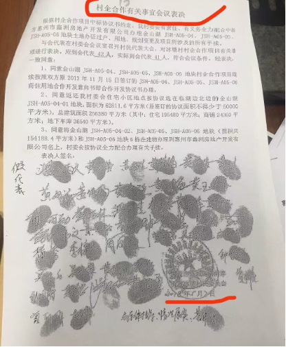 记者调查发现,刘先生所质疑造假的2018年5月2日的《村企合作有关事宜会议表决》显示,同意按照原2013年11月15日签订的商住用地合作意向书继续履行,41名村民代表(应到42人)“一致同意”合作,文件附有签名和手印。