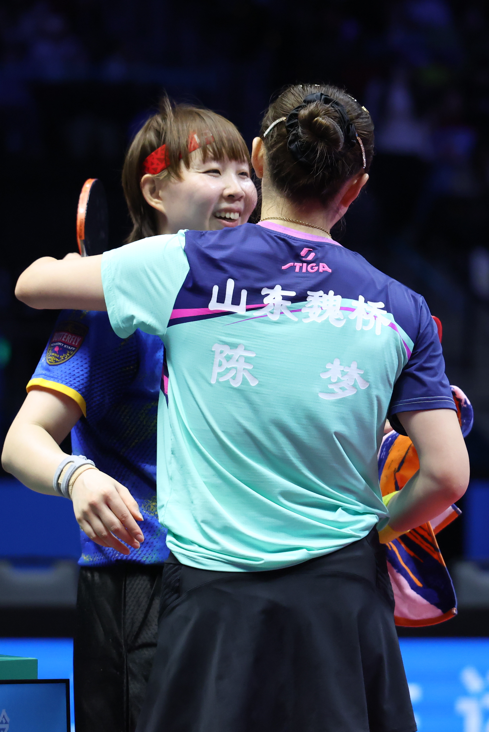 11月16日,山东队选手陈梦(右)和澳门队选手朱雨玲在比赛后拥抱。新华社
