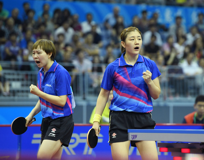 2017年9月5日,朱雨玲(左)/陈梦在第十三届全国运动会乒乓球女子双打半决赛中。她们4-2战胜山东/湖北组合选手刘高阳/冯亚兰,晋级决赛。新华社记者 牟宇 摄