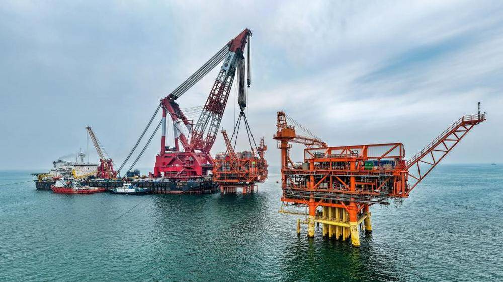9月8日,垦利6-1油田10-1北区块Ⅱ期开发项目油气平台在渤海海域完成海上安装(无人机照片)。新华社发(杜鹏辉 摄)