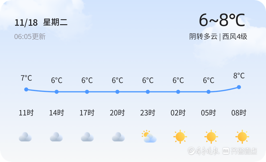 今天是11月18日,星期二,农历九月廿九。威海市今日天气阴转多云,气温介于6℃至8℃之间,西风4级,空气湿度为50%,PM2.5指数为23,空气质量良好。各区天气情况基本一致,均为阴转多云,风力适中。预计今日最高温度8℃,最低温度6℃,市民出行需注意保暖。