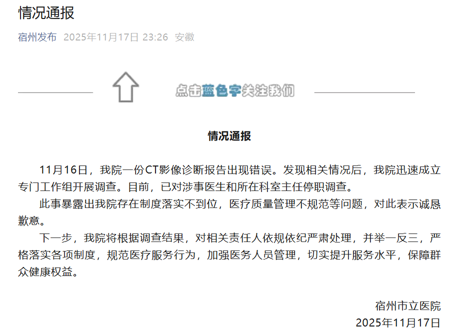 11月17日晚,安徽宿州市立医院就CT影像诊断报告出现错误一事发布情况通报。