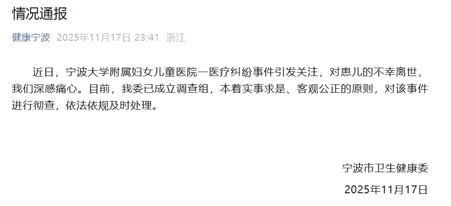 近日,宁波大学附属妇女儿童医院一医疗纠纷事件引发关注,对患儿的不幸离世,我们深感痛心。目前,该委已成立调查组,本着实事求是、客观公正的原则,对该事件进行彻查,依法依规及时处理。