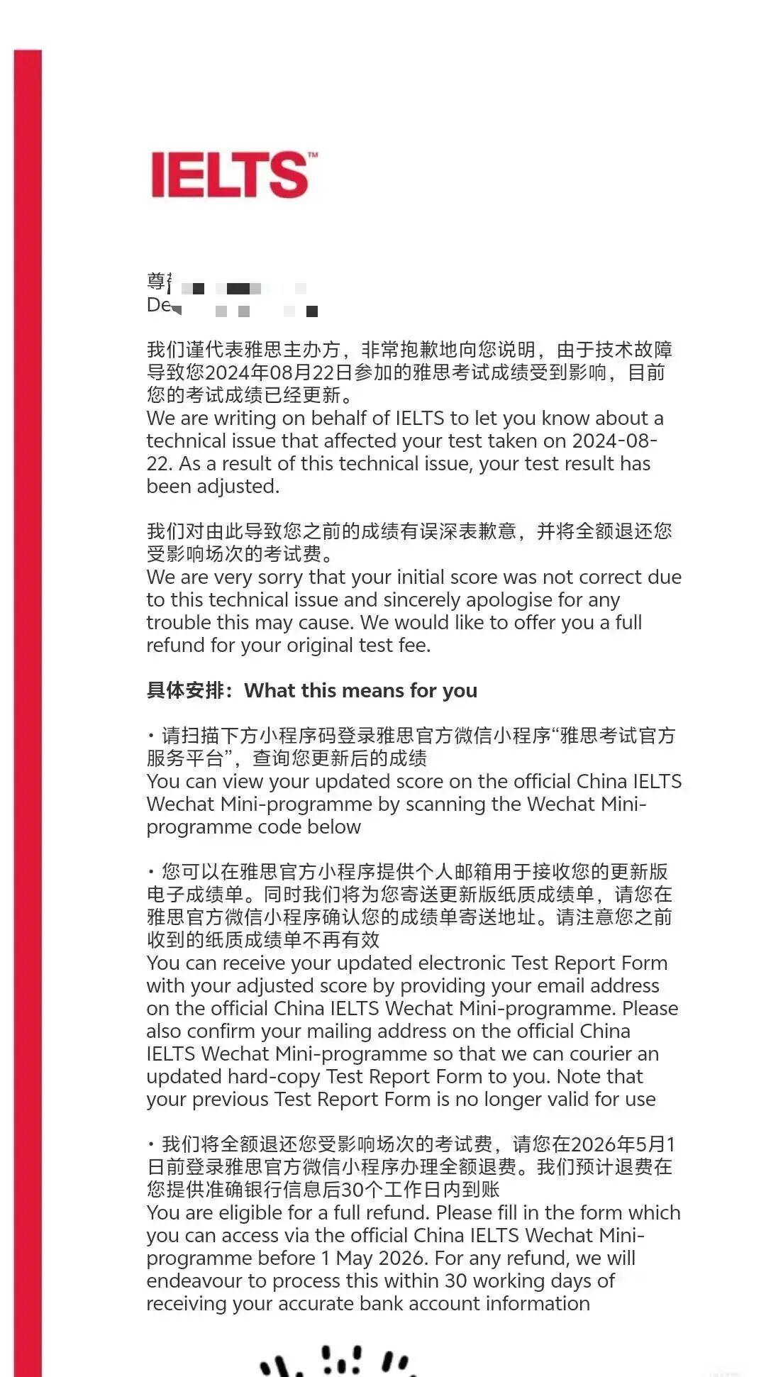 近日,雅思主办方向部分考生发送邮件,表示由于技术故障导致考生参加的某次雅思考试成绩受到影响,目前考试成绩已经更新,同时对由此导致成绩有误深表歉意,并将全额退还受影响场次的考试费。