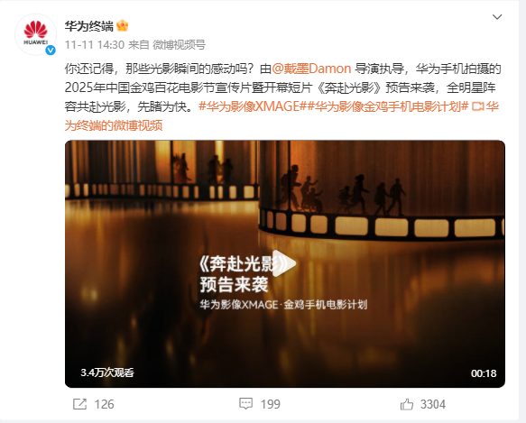 据了解,华为终端官方于11月11日在微博分享了第 38 届中国金鸡百花电影节宣传片暨开幕短片 ——《奔赴光影》,该片由第38届金鸡奖最佳导演 @戴墨Damon 执导、采用最新华为手机拍摄。