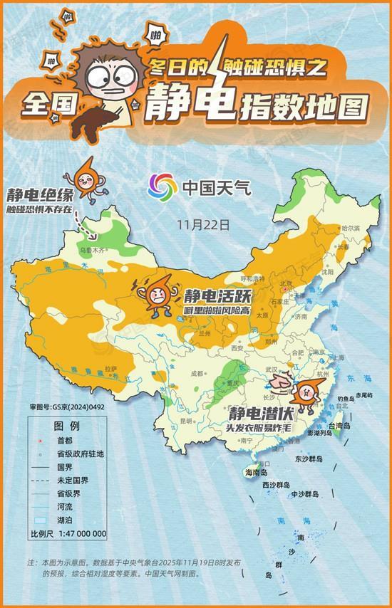 11月21日至22日,新疆南部、西藏大部、内蒙古大部、甘肃、宁夏、陕西、山西、北京和河北北部等地静电仍活跃,需注意增加室内湿度。江南、华南大部地区仍属静电潜伏区,新疆北部、四川盆地、海南东部的一些地方湿度有所增加,加入静电绝缘区域。