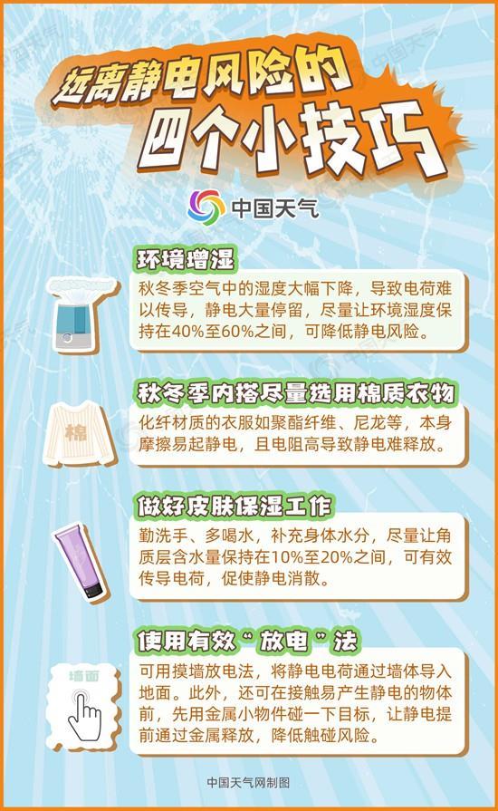 未来三天,不仅北方,南方多地天气也将十分干燥,静电风险较高,“增湿放电”四个小妙招请收好,助你降低静电风险,轻松缓解触碰烦恼。