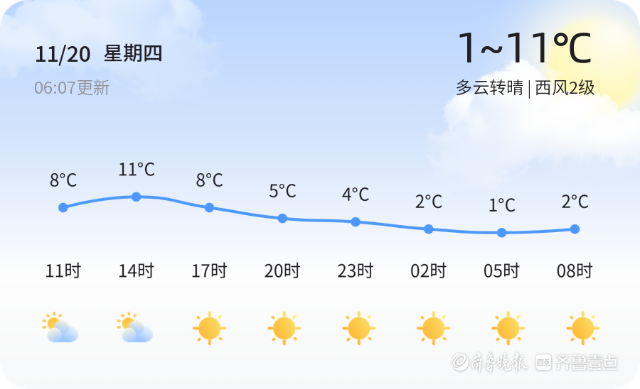今天是11月20日,星期四,农历十月初一。临沂市今日天气多云转晴,气温在1℃至11℃之间,西风2级,空气湿度57%,PM2.5指数83。各区天气情况总体平稳,以多云转晴为主,适合市民户外活动。目前时间为早上607,实时气温2.9℃,天气状况良好。