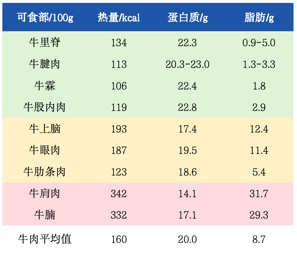 不同部位的脂肪含量差别很大,建议优先选择牛腱肉、牛里脊等脂肪含量相对较低的瘦肉部位。