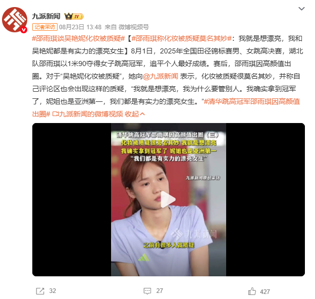 邵雨琪获全运会女子跳高金牌,曾为吴艳妮发声:我们都是有实力的漂亮女生