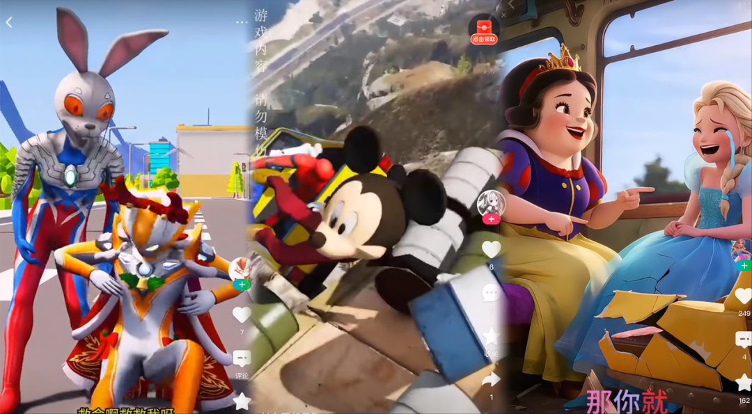 “白雪公主霸凌艾莎” “米奇在山顶脚踹蜘蛛侠”“兔头面具奥特曼打晕绑架小奥特曼”/图源:潮新闻