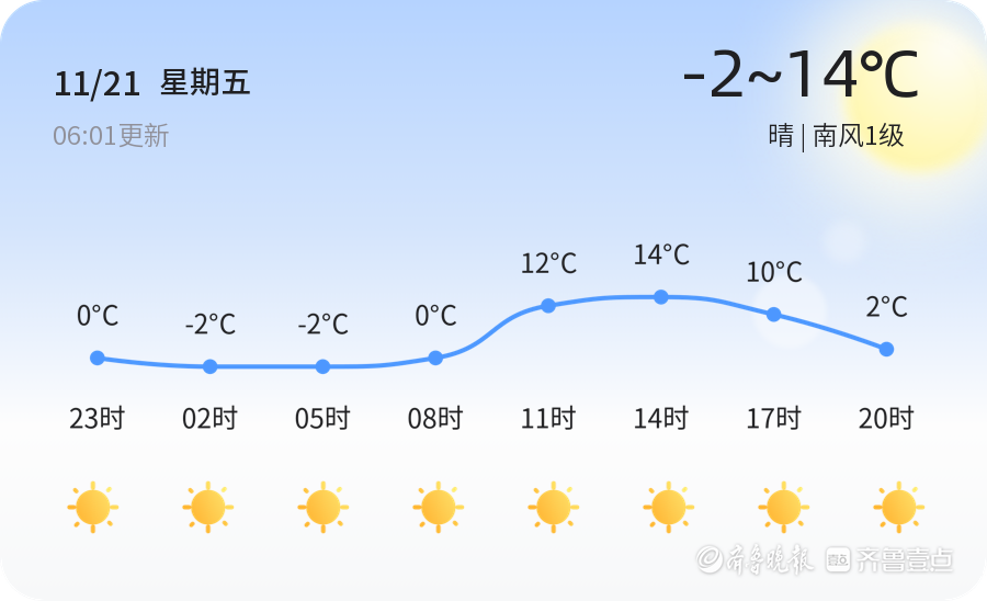 今天是2025年11月21日,星期五,农历十月初二。淄博市迎来晴好天气,气温范围在-2℃至14℃之间,南风1级,空气湿度79%,空气质量为良(PM2.5为74)。早晨气温较低,市民出行时需注意保暖,建议穿棉衣或羽绒服,并根据气温变化及时增减衣物,以免着凉。