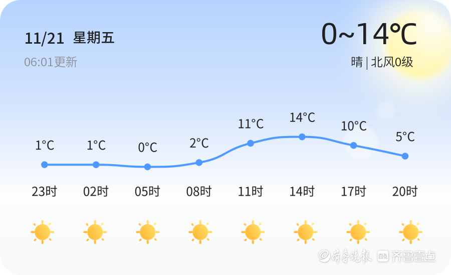 今天是11月21日,星期五,农历十月初二。枣庄市今日天气晴朗,北风0级,当前气温为-0.1℃,相对湿度89%,PM2.5指数为145。今日最高气温可达14℃,最低气温为0℃。各区天气情况一致,均为晴朗天气,适合市民户外活动。