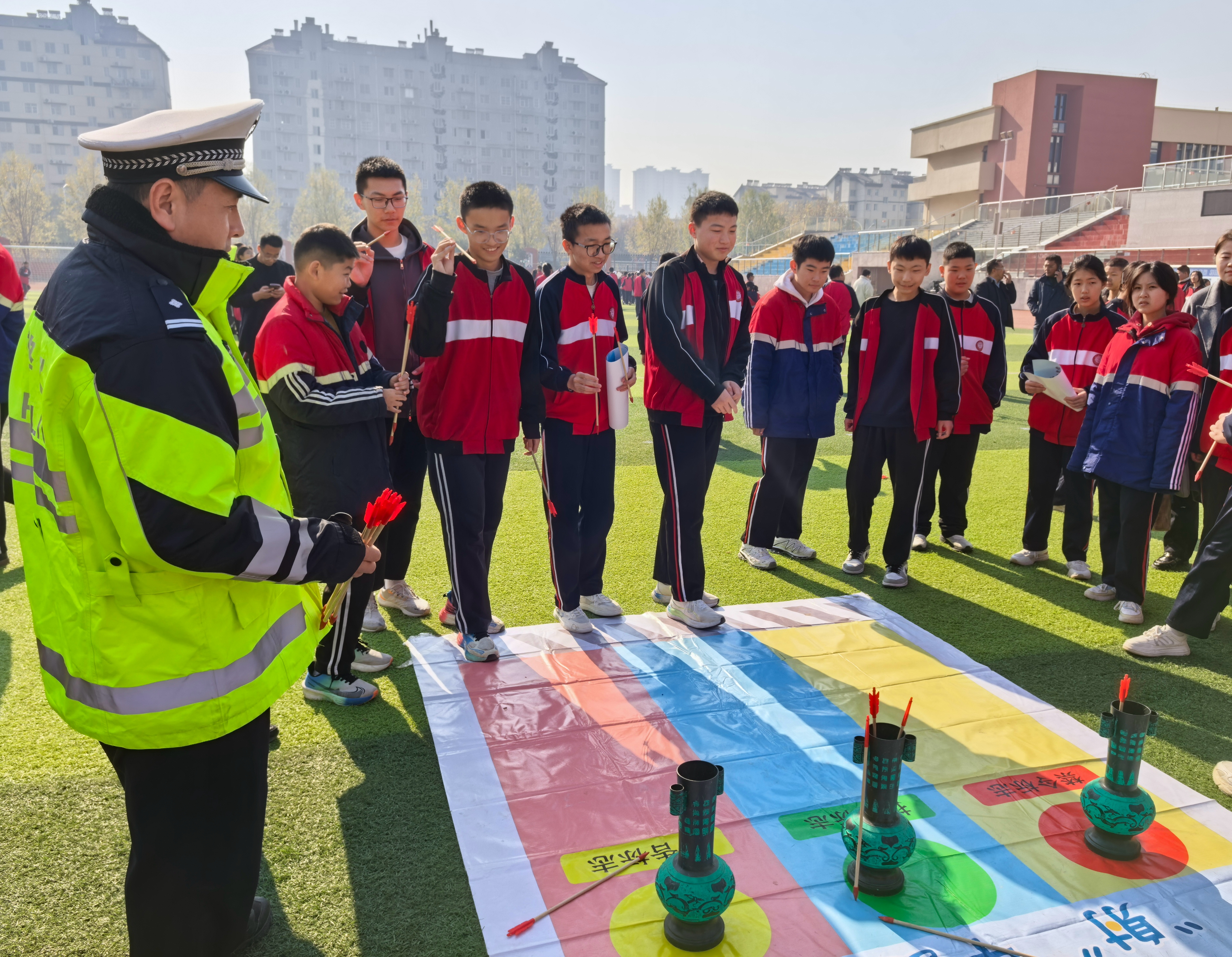在学校操场设置了展板观摩与互动体验区,反诈民警为师生们答疑解惑,详细解读展板上的案例和防范要点,并发放反诈宣传手册。交管民警将孔子六艺“礼、乐、射、御、书、数”融入到交通安全游戏互动中,通过布置“礼让三先”“乐在其中”“射中安全”“御驾平安”“书写交规”“数你最棒”六个游戏关卡,组织同学们一路过关斩将,在寓教于乐中让同学们学习到交通安全知识。同时,通过趣味游戏和实物演示,利用道具讲解了车辆盲区、安全带和安全头盔等知识,学生们纷纷进行模拟体验,在实践中掌握了正确的交通行为规范。