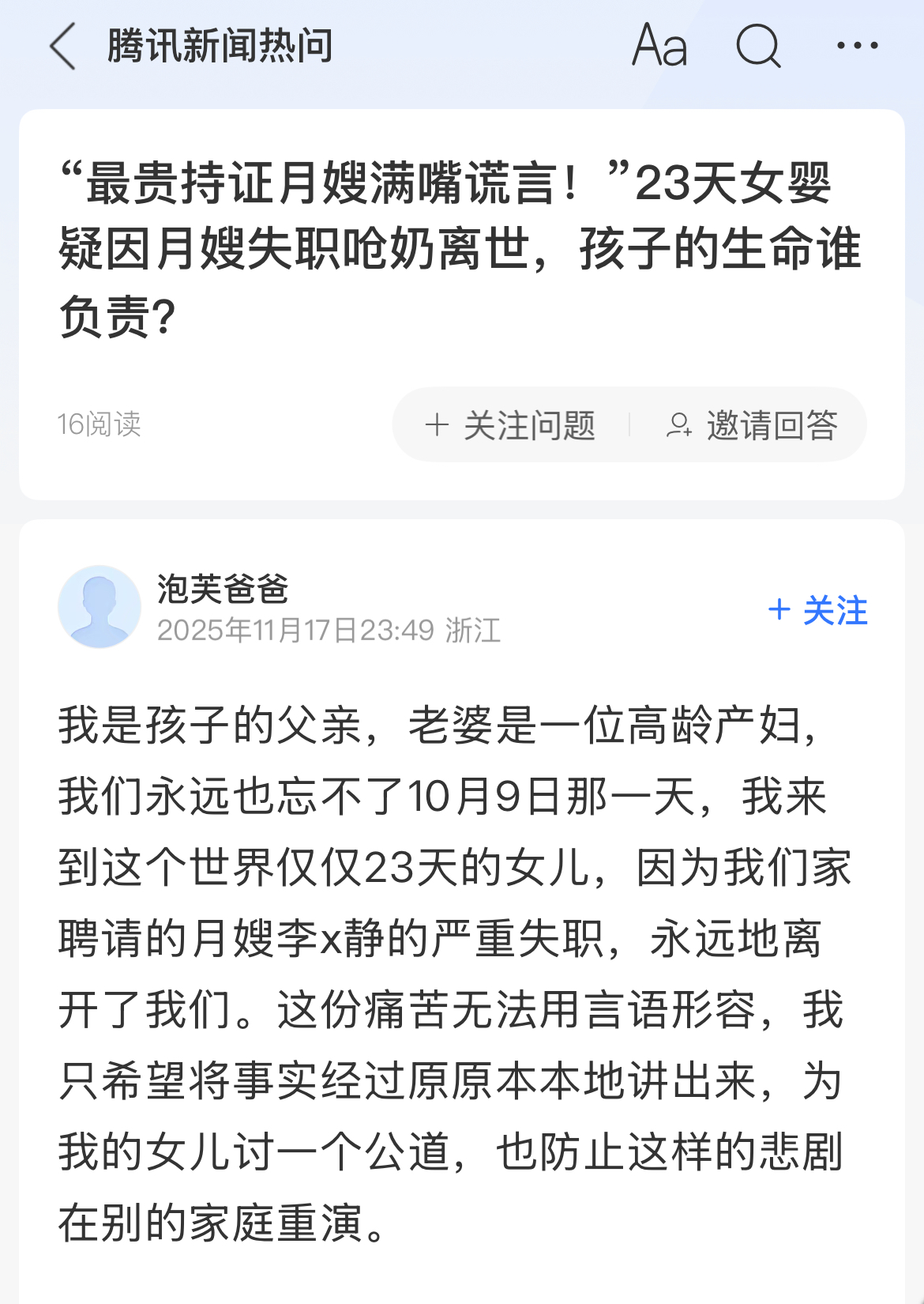 近日,杭州市的奉先生腾讯新闻热问上发声,称自己出生仅23天的女儿因为月嫂的严重失职不幸去世。奉先生认为,月嫂错误的喂奶方式、宝宝呛奶后未能及时处置甚至隐瞒呛奶情况,导致宝宝最终窒息死亡。
