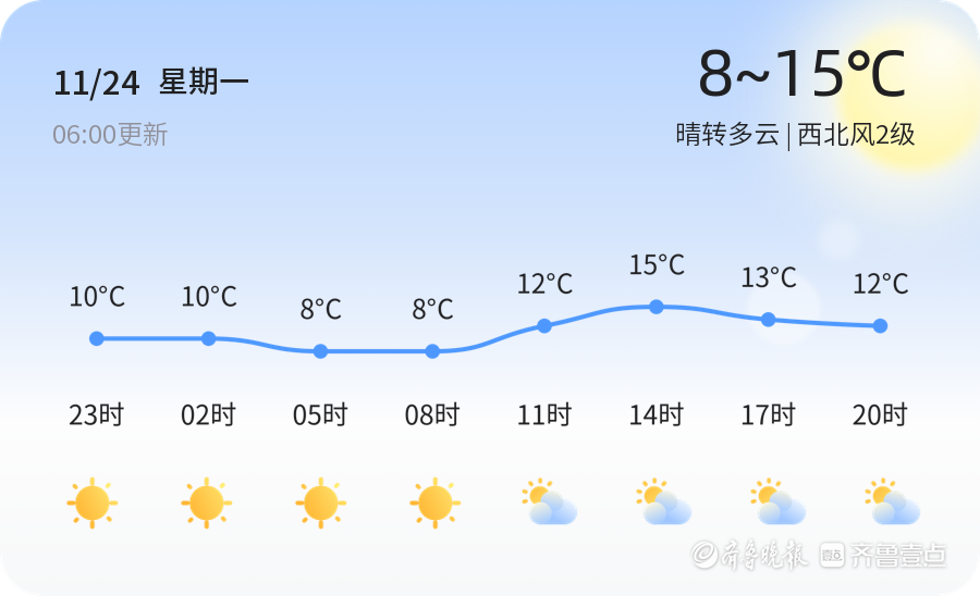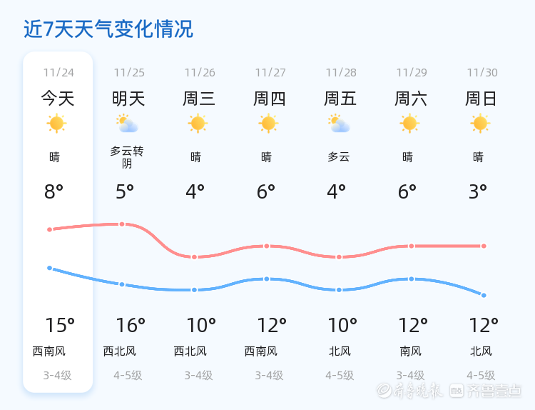 未来三天,青岛市天气以晴到多云为主,气温逐渐下降,最低气温将达到4℃,最高气温为16℃。建议市民根据天气变化适时增减衣物,特别是夜间和早晨气温较低,需注意保暖。