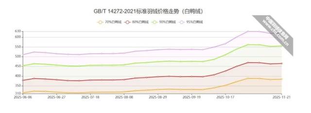 可猪肉价格也不是今年才掉下来的。自2021年猪肉开始降价,鸭鹅的养殖就受到了影响,羽绒价格一直慢涨。按新国标羽绒服装90%绒子含量标准,2023年1至2024年11月,白鸭绒与白鹅绒的价格已分别从约350元/公斤和700元/公斤涨至约500元/公斤和约1100元/公斤,今年11月又分别达到570元和940元。这一年中鸭绒仍在涨价,但涨幅已经不似一两年前那般猛烈,鹅绒甚至还降价了。这背后,或是为了控制成本,众多品牌纷纷减少鹅绒用量,转向鸭绒——高端的羽绒服成本保持了稳定,但普通羽绒服成本涨了。