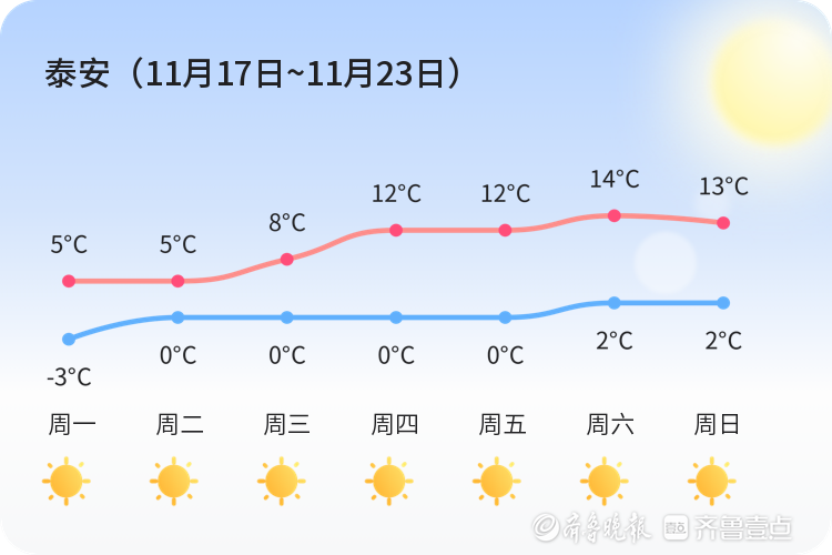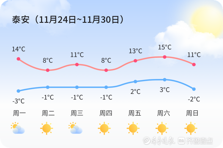 上周总体以晴为主基调。 上周气温变化情况: 最低气温-3~2℃,最高气温5~14℃。空气质量方面总体良,几乎每天都是好空气! 具体气温变化情况如下图。 本周(11月24日~11月30日)预计接下来几天我市晴天比较多。具体天气情况请关注每日天气情况预告。 全市周平均最高温11℃,平均最低温0℃,平均气温5℃,周最高气温15℃,出现在周六,周最低温-3℃,出现在周一。 具体气温变化情况如下图。