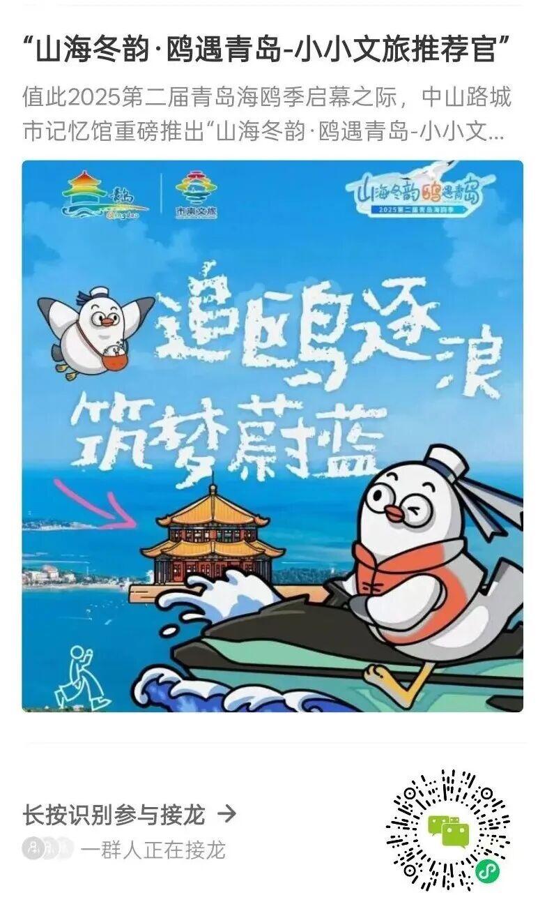 目前,活动报名通道已正式开启,感兴趣的中小学生及家长可通过识别活动专属二维码接龙报名。这个冬天,让我们期待一群“小荐官”带着对家乡的热爱,用镜头捕捉鸥鸣冬韵,向全国发出青岛的冬日邀约。活动最终解释权归青岛中山路城市记忆馆所有。