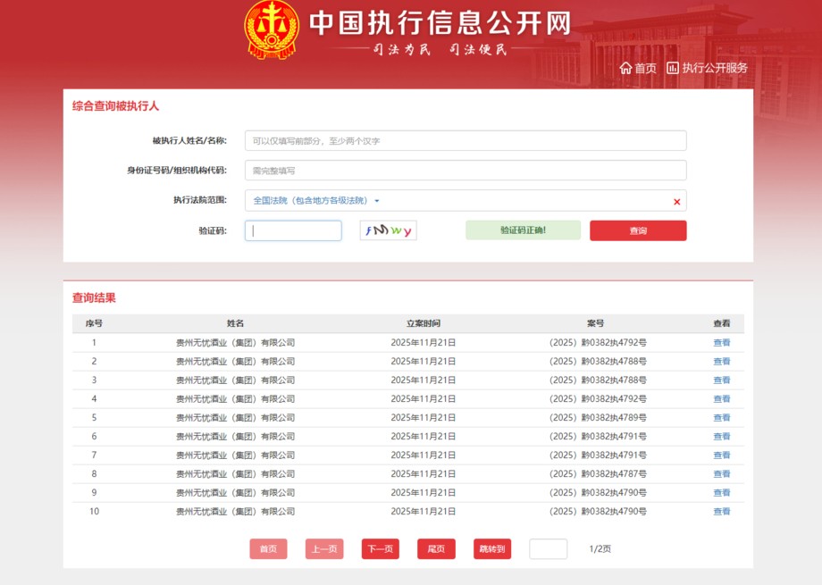根据中国执行信息公开网最新数据显示,贵州无忧酒业(集团)有限公司新增多则被执行人信息,执行法院为仁怀市人民法院,立案时间为2025年11月21日,总执行标的高达6200余万元人民币。